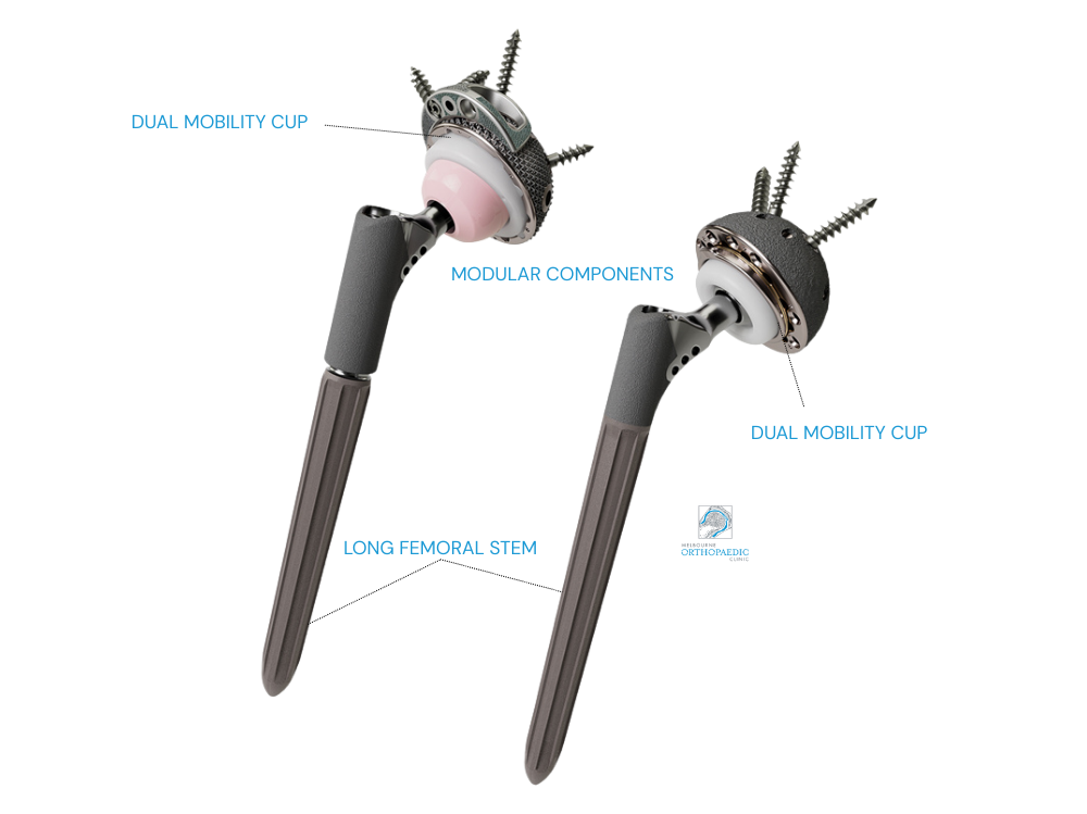 - Dual mobility cups or constrained liners to reduce the risk of dislocation in cases of soft tissue laxity or instability
